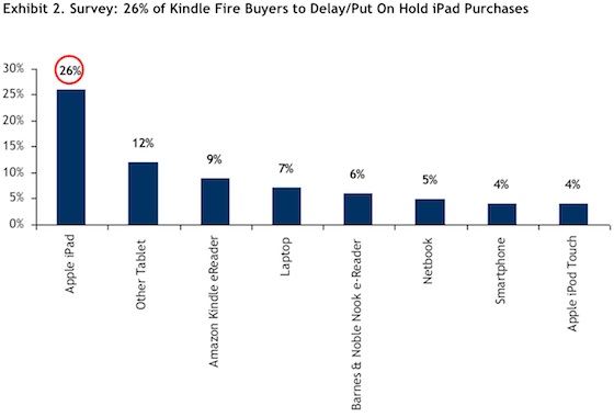 A new survey from RBC Capital Markets and ChangeWave Research now puts some numbers to that impact, revealing that 26% of those surveyed customers who have either already pre-ordered a Kindle Fire or are "very likely" to purchase one have either delayed or put on indefinite hold previously-planned iPad purchases.